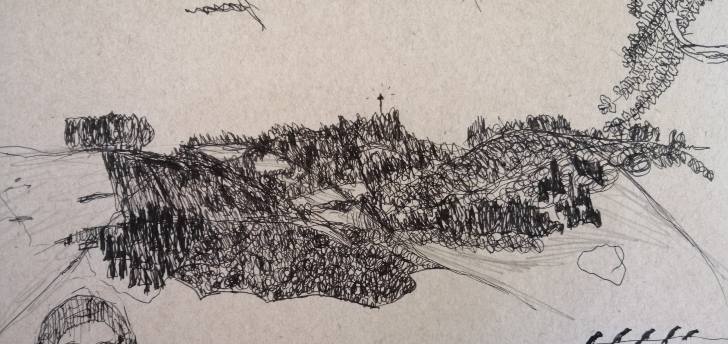 Fue mi primer intento, un dibujo de memoria, que trataba de resaltar los eucaliptos, pinos y demás especies sembradas que aparecen en la tierra, como gigantes en un cuento de jueces y abogados, sin razones ni contextos. En ese intento inicial, mi mirada de las montañas se parece a la idea de que son estructuras separadas entre sí y desconectadas del paisaje. Los únicos árboles que dibujé son altos e imponentes eucaliptos. En los demás espacios, la tierra está llena de nada. Las montañas se parecen al fondo de un dibujo infantil que, están ahí, para indicar que la casita está en el campo y que atrás hay un verde limón, como el color del pasto podado.