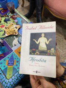Llevé a la sesión cuatro opciones de libros, pero la elección se decantó por el clásico de Isabel Allende, Afrodita. Cuentos, recetas y otros afrodisíacos. Yo nunca leí con rigurosidad la literatura de Isabel, pero este libro me acompaña desde la adolescencia, cuando junto a mis amigas, solíamos acudir a ella como un oráculo en donde encontrar respuestas y encantamientos del amor, el cuerpo, la sensualidad y la comida.