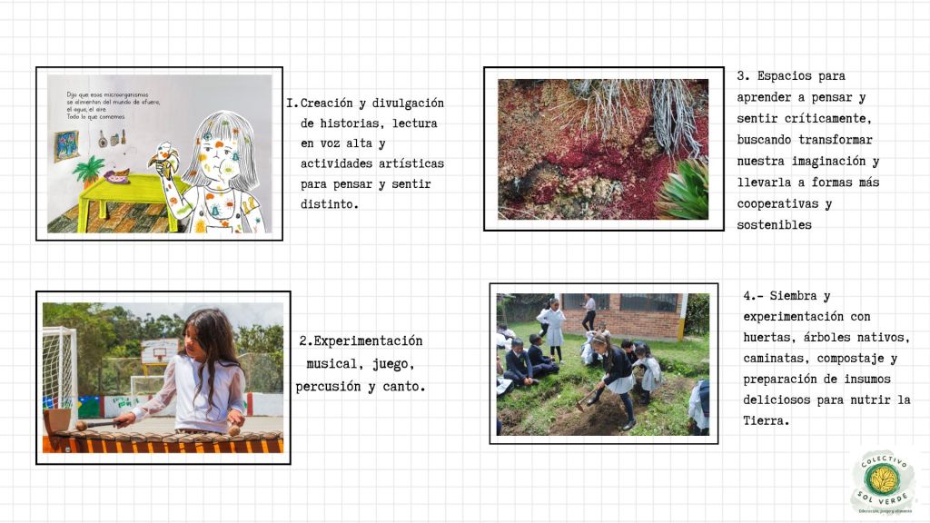Nuestro trabajo además, se ha enfocado en el trabajo en las escuelas rurales de la vereda de Río Frío en Tabio y los espacios públicos como la biblioteca La Cabrera, en donde también llevamos nuestras ideas y deseos de transformar nuestra relación con el resto del mundo, y aprender del mismo con una mirada curiosa, compasiva y llena de amor con los niños, niñas y las personas de todas las edades que atienden nuestra invitación.